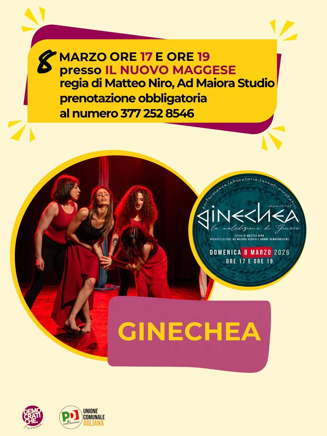 L’Associazione Ad Maiora, con la Regia di Matteo Niro, presente GINECHEA. Lo spettacolo si svolgerà presso IL NUOVO MAGGESE in via Mazzini. Prenotazione obbligatoria al 377 252 8546.