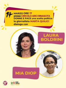 DONNE E PACE. La giornalista Marta Quilici intervista la Onorevole Laura Boldrini e La Vicepresidente della Regione Toscana Mia Diop. L’evento si terrà presso il Salone al primo piano del circolo Rinascita in Via Roma